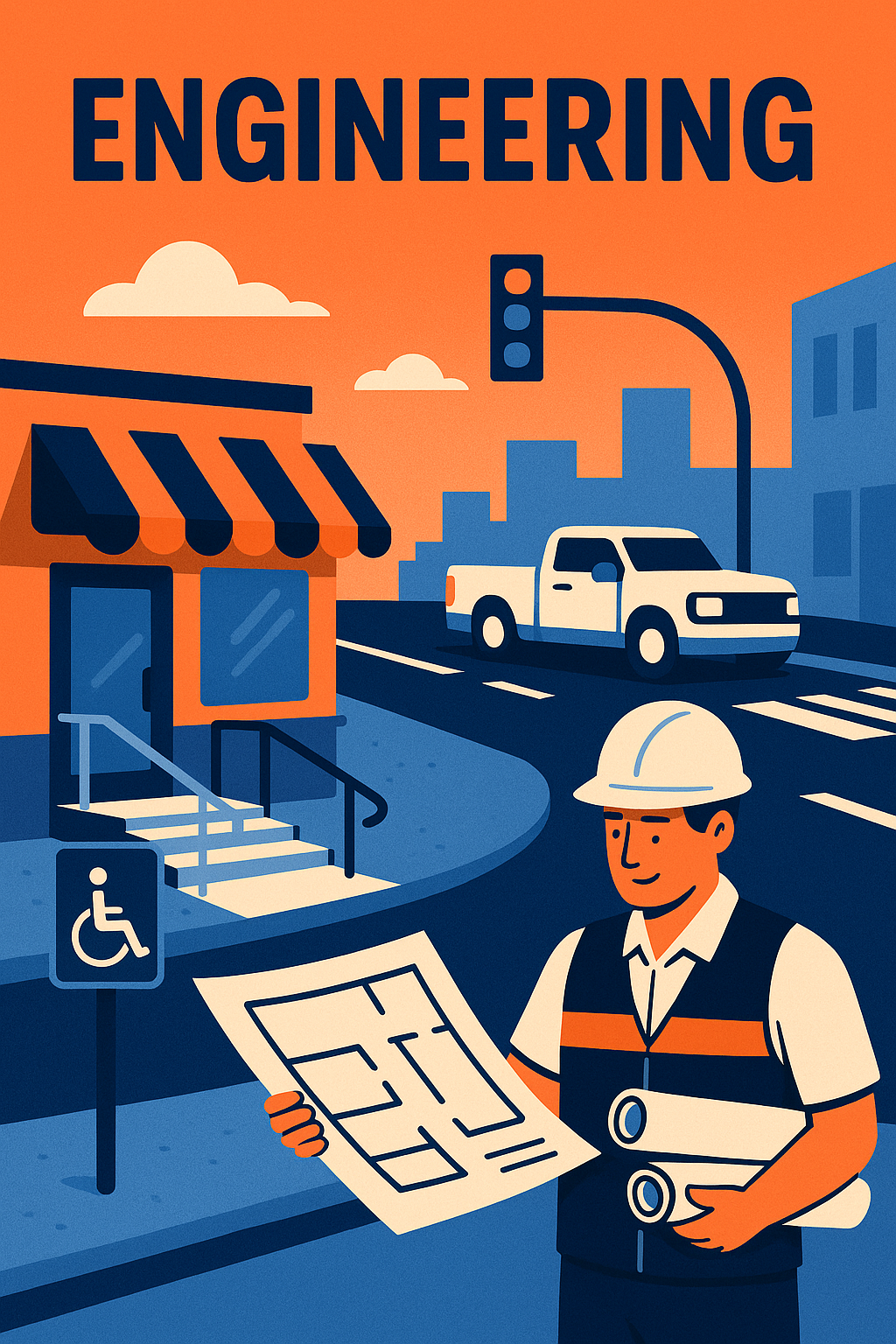 Civil site plans, grading & drainage, ADA-compliant parking layouts, traffic control plans, CAD drafting, and QA/QC support.